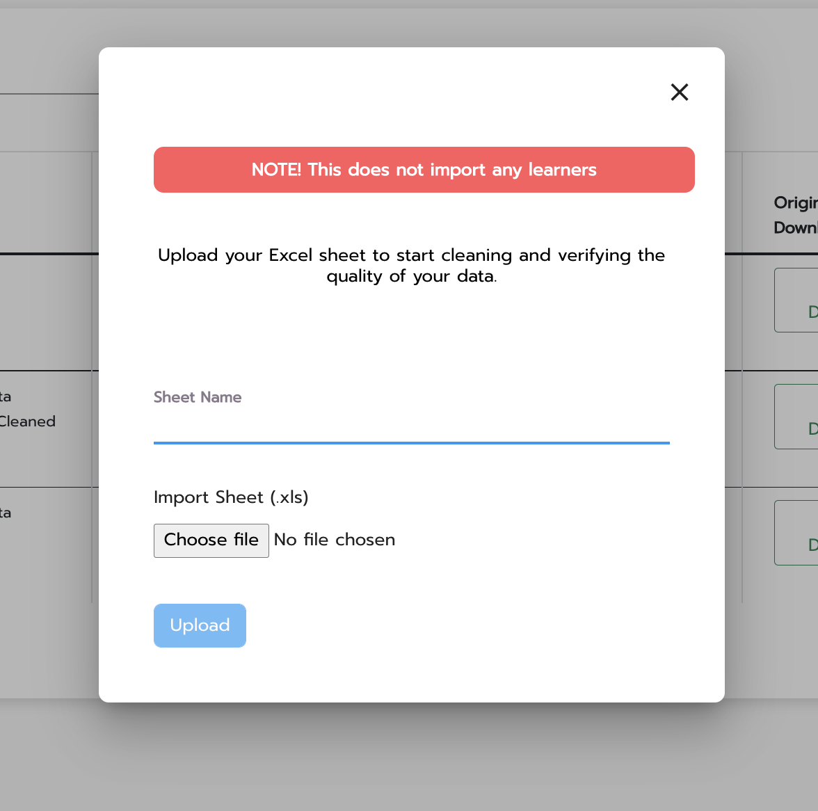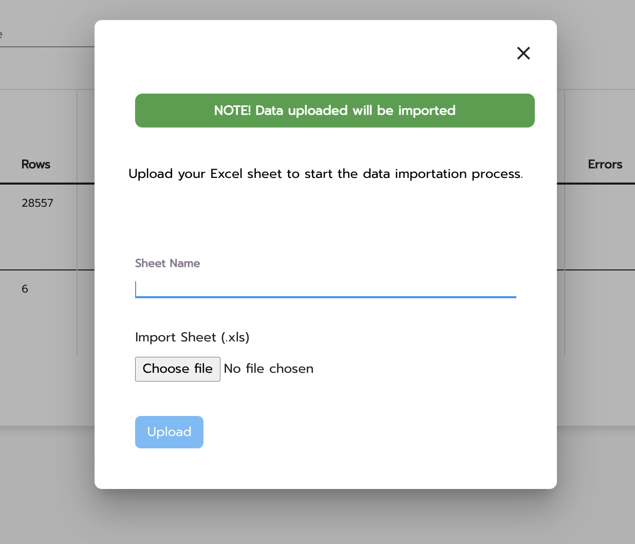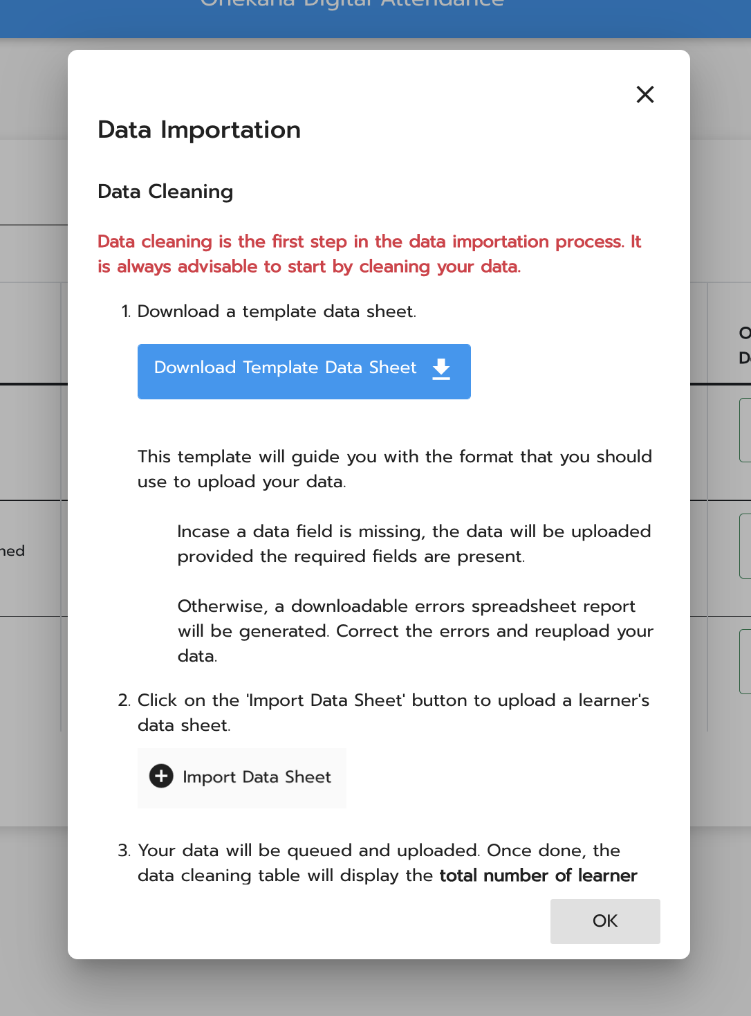 Data cleaning is the first step in the data importation process. It is always advisable to start by cleaning your data.Download the template data sheet, populate your data and upload your data sheet. Data uploaded in the cleaning stage is not imported. Once clean and verified, navigate to the 'Data Importation' section and upload your data.