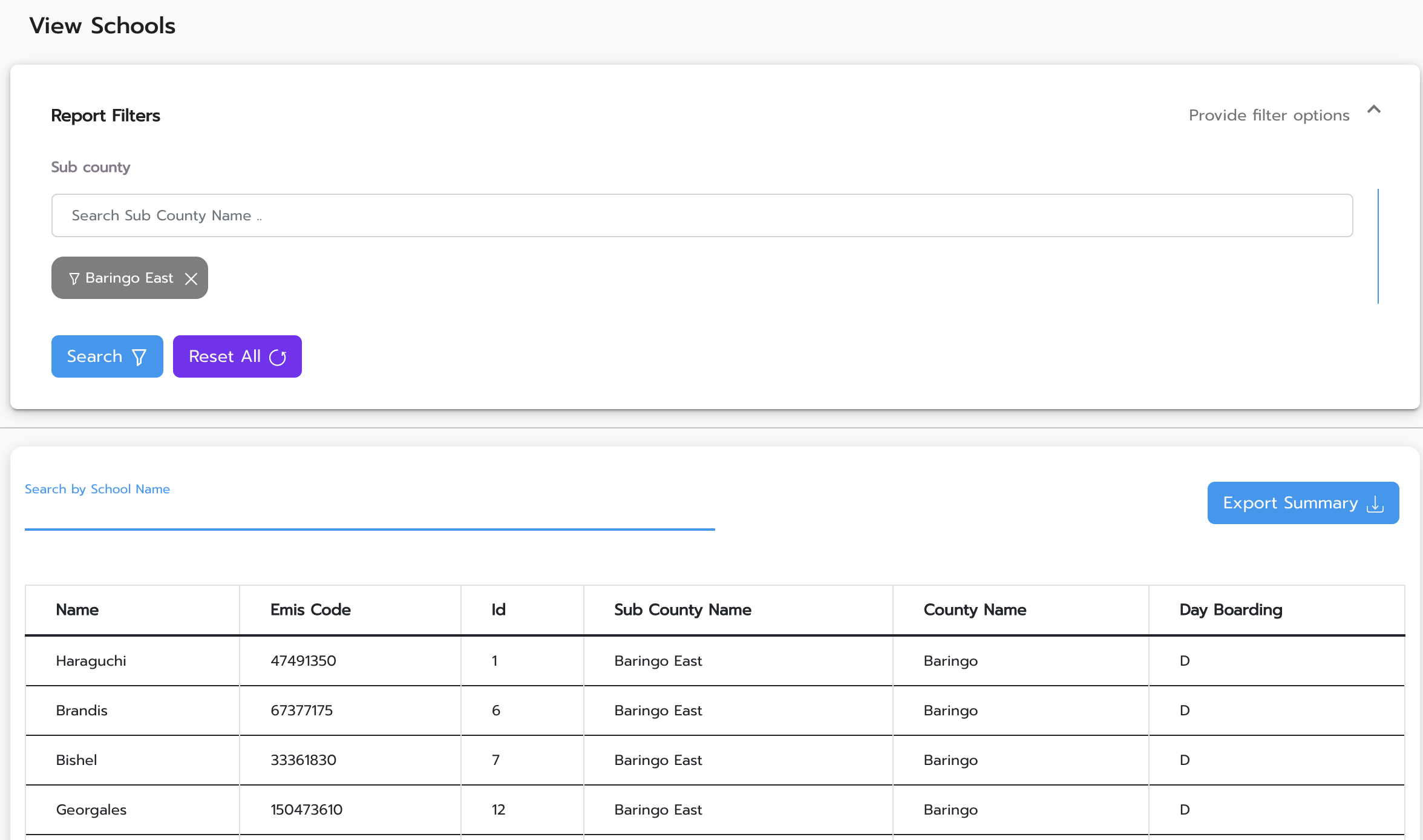 View current schools details. Filter by sub-county to search for your school. You can also export the summary of the data.
