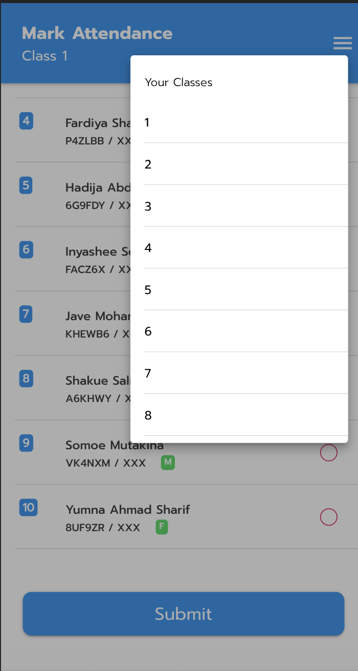 On the top right, there’s a menu icon with a list of classes. A teacher can switch to a different classroom and mark attendance for that class room.