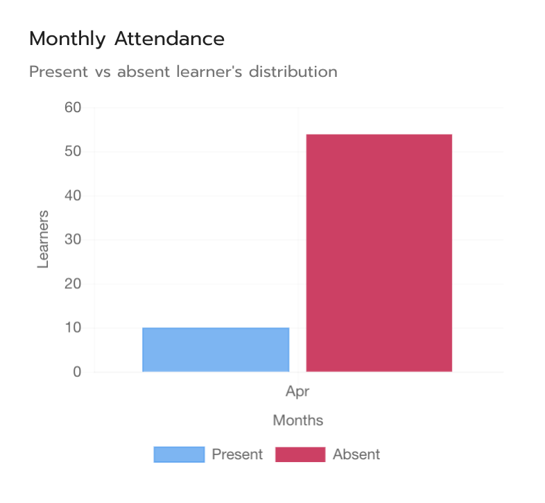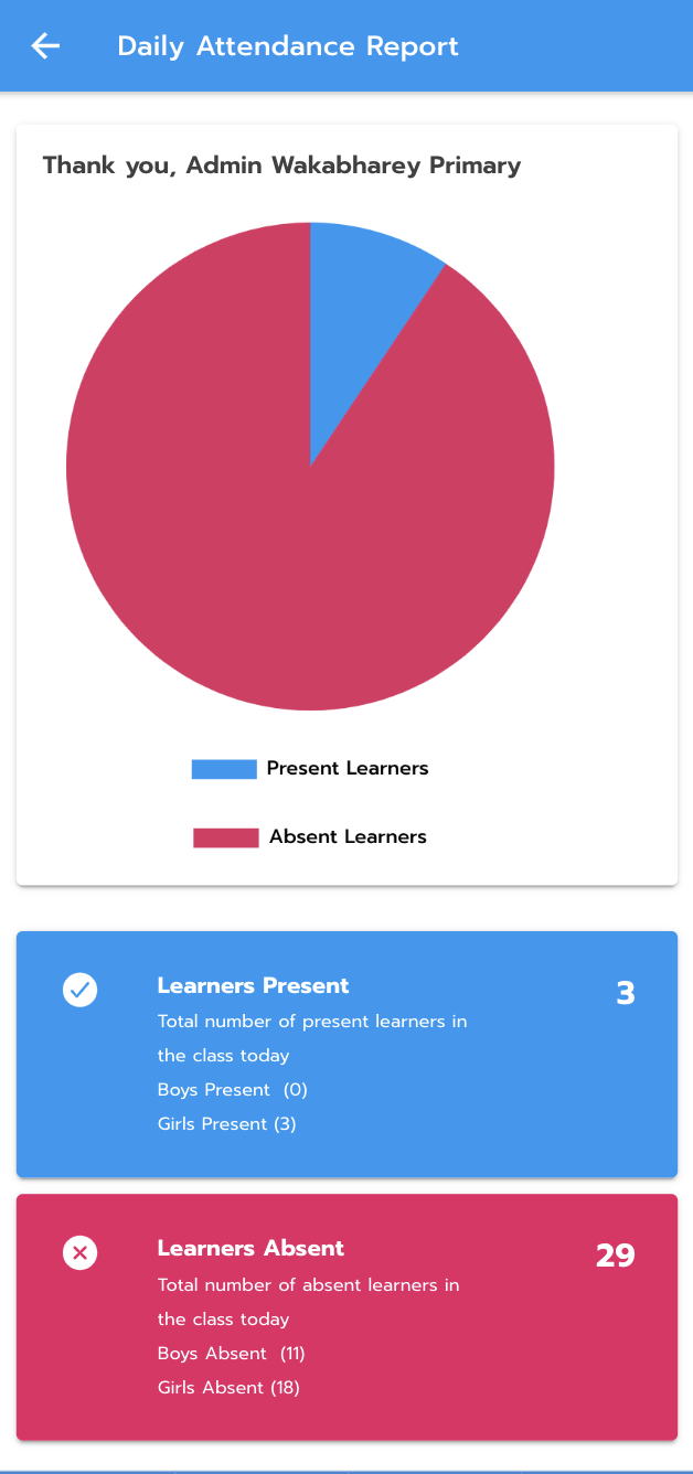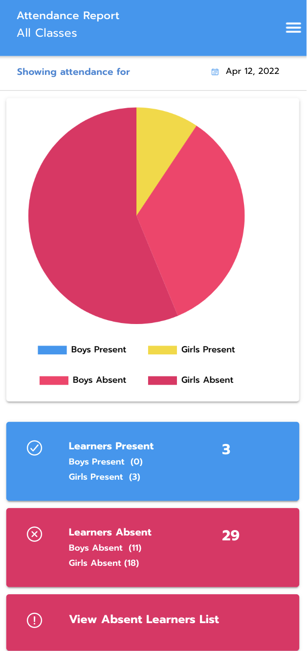 After marking attendance, a daily attendance report provides an overview of the marked learners status for that class. The report shows a chart of present vs absent learners and these numbers segmented by gender.