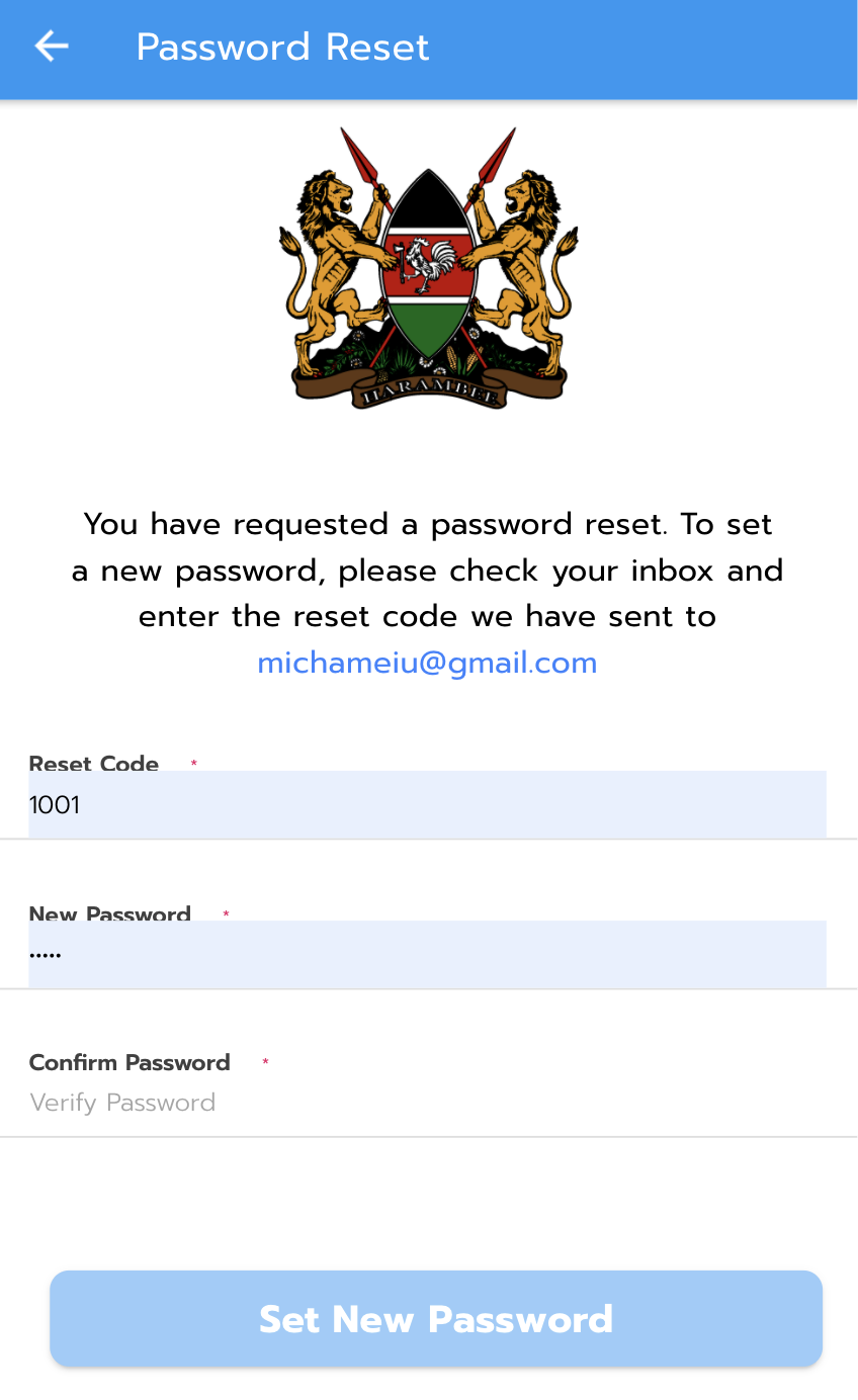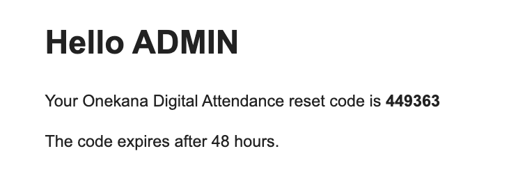 Once successful, enter the reset code sent to your email address. Here is a sample email.