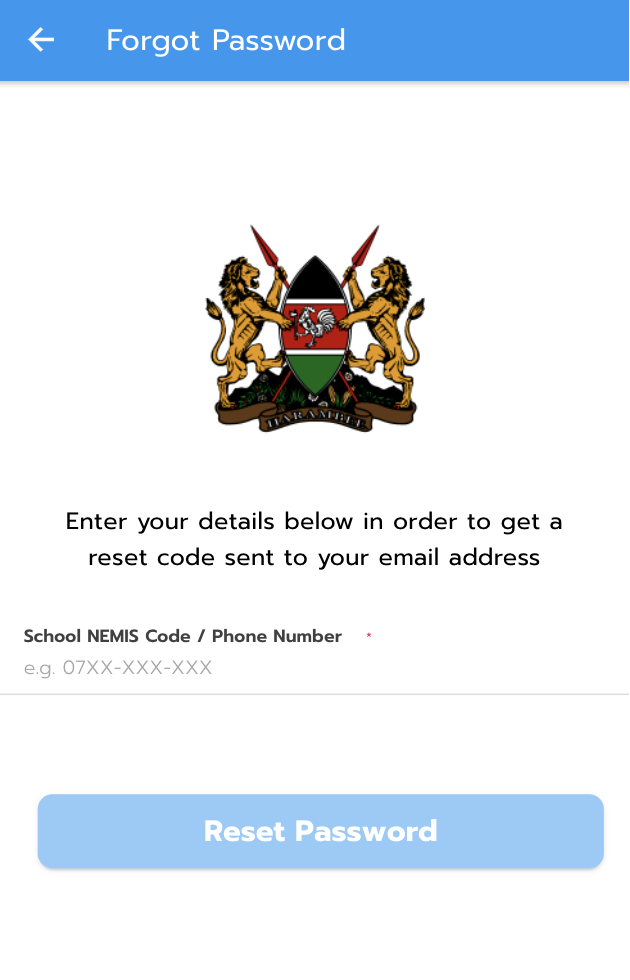 In the case of a forgotten password, click the Forgot Password button on the login page and enter your school code or phone number in the Forgot Password screen.