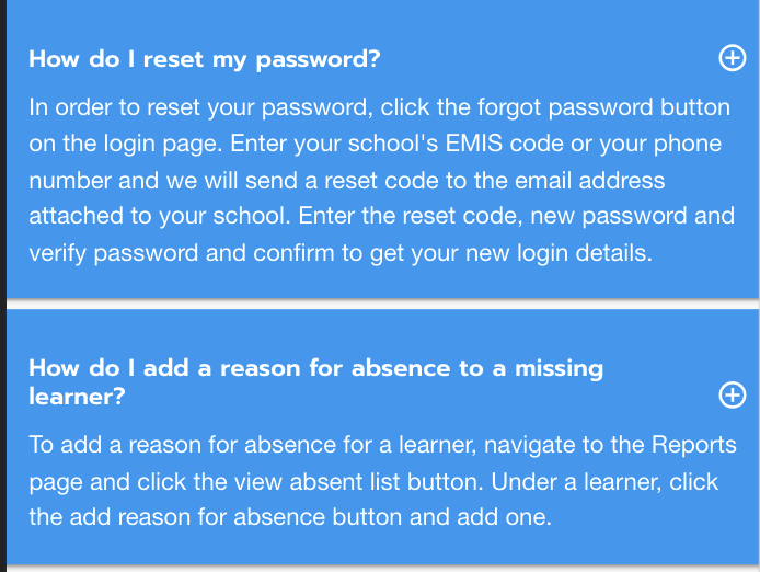 Access a list of frequently asked questions and a user manual with more information on how to operate the Onekana Digital Attendance System.