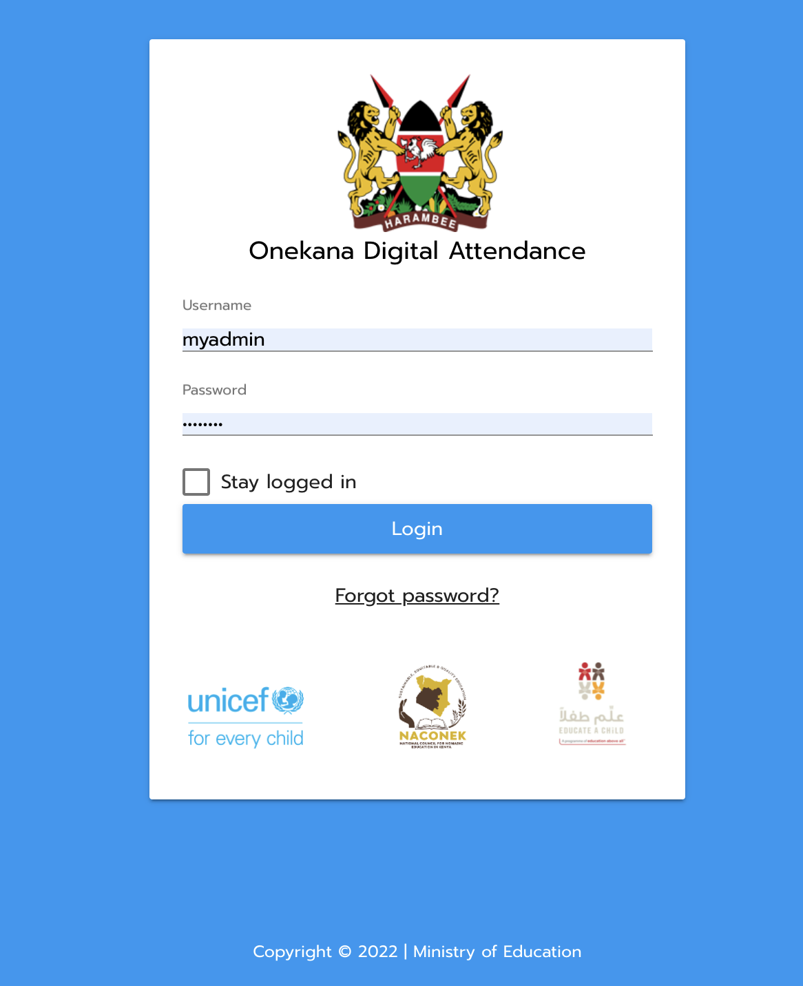 Onekana Digital Attendance's dashboard is hosted at Onekana Dashboard. Enter your login credentials to access the dashboard.