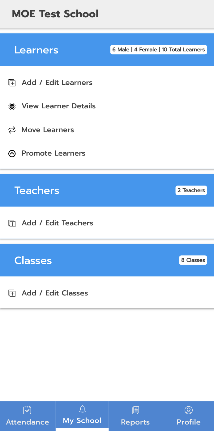 The My School tab enables a headteacher to manage their school. Here, they can Add / Edit Learners, View More Learner Details and Move / Promote Learners. In this section you can also Add / Edit Teachers and Add / Edit Classrooms to a school.