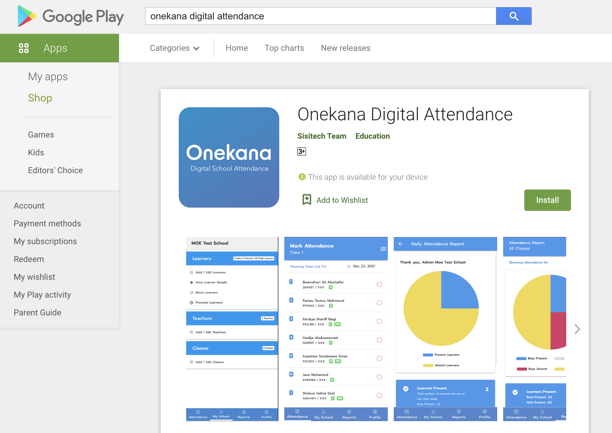 The Getting Started section explains how to install the Onekana Digital Attendance app on a device. To Download the mobile application, head to the Google Playstore on an Android device and search for “Onekana Digital Attendance”. To access the application on the PlayStore, click Onekana Play Store.