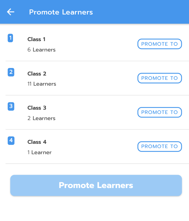 Graduate learners to the next grade at the end of the year. This feature works to promote all learners to the next grade once. Be careful when promoting learners.