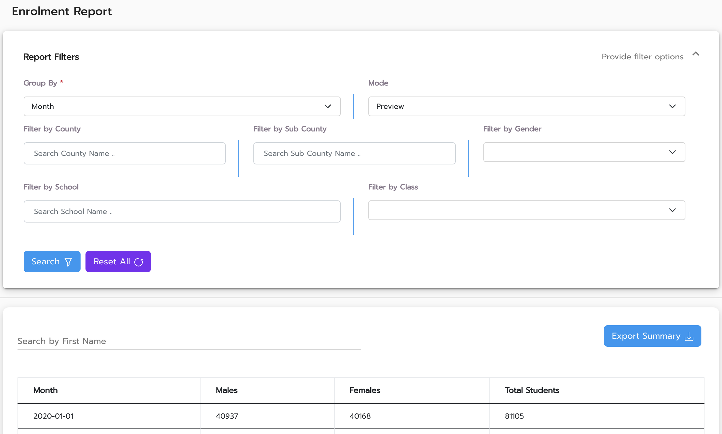 Select to view and generate either enrolment or attendance data reports. Filter and group your reports by county, sub county, class, school , age etc. You can also export and download a report summary.