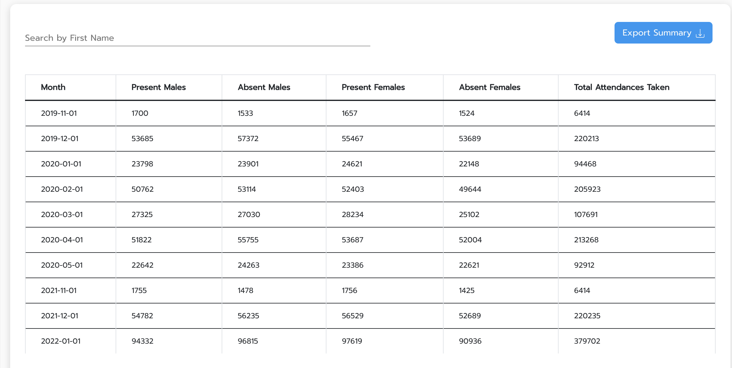 The Reports tab allows the head teacher to view an aggregated list of student attendance perfomance per class, based on gender. Head-teacher's can also view on a daily basis a list of often absent students from every class on a certain date and provide a reason for absence for missing school.
